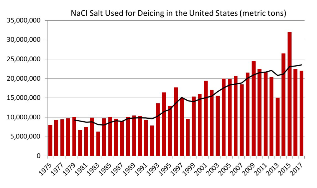 During the winter, salts are the most commonly used deicing agents — keeping our streets and sidewalks safe from ice and snow. When a salt (like sodium chloride, magnesium chloride or calcium chloride) dissolves in water, it lowers the freezing point, preventing or melting ice below the usual 32 degrees Fahrenheit. By reducing the amount of dangerous ice on the roads, salts undoubtedly prevent injury and save lives. Studies show that salts can reduce road collisions by around 85% depending on the weather conditions. In the United States, road salt usage has more than doubled since 1975. While safety is a top priority, when salt is overapplied it can cause negative effects to the environment, corrode infrastructure and contaminate our drinking water.